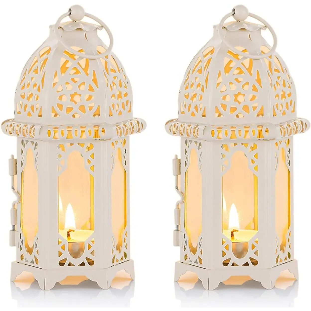The lantern is made from metal with transparent glass panels, finished in a captivating cobalt hue that evokes a Moroccan aesthetic. The structure is designed to be both visually striking and functional, with a focus on portability and durability.