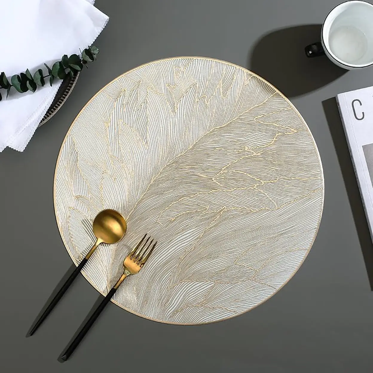 Round Placemats , 15 Inch Washable Gold Table Mats for Dining Table Pressed Leaf Vinyl Place Mats for Holiday Wedding Party Decoration,4pcs