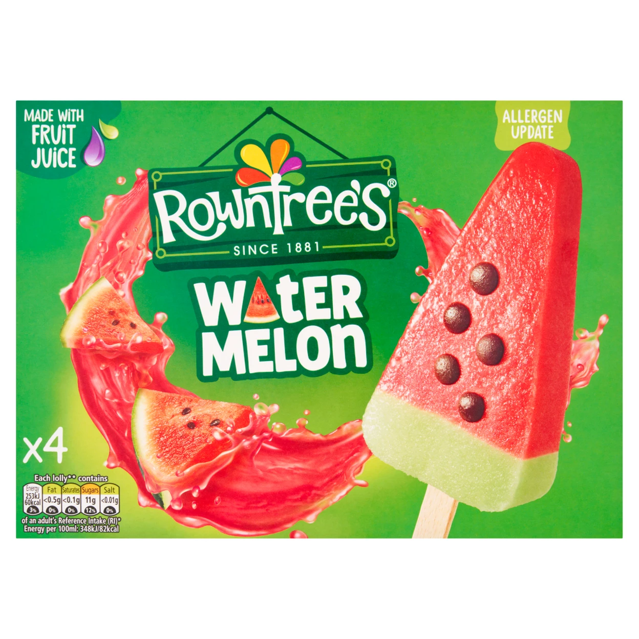 At Rowntree’s, we are passionate about creating fun, fruity ice lollies that burst with juicy flavor in every bite. Our Watermelon Ice Lollies are a perfect way to enjoy the taste of summer all year round. Made with real fruit juice and no artificial colors, flavors, or preservatives, these lollies are a delightful treat for all ages. Enjoy the refreshing taste of watermelon and apple with a hint of chocolatey bits, crafted for the whole family to share as part of a balanced diet and healthy, active lifestyle.
