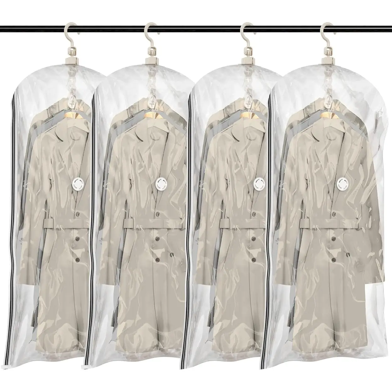 Saves up to 4X more space with 4 long vacuum storage bags (53 x 27.6 inches each), ideal for storing suits, coats, dresses, and jackets with any regular vacuum cleaner.