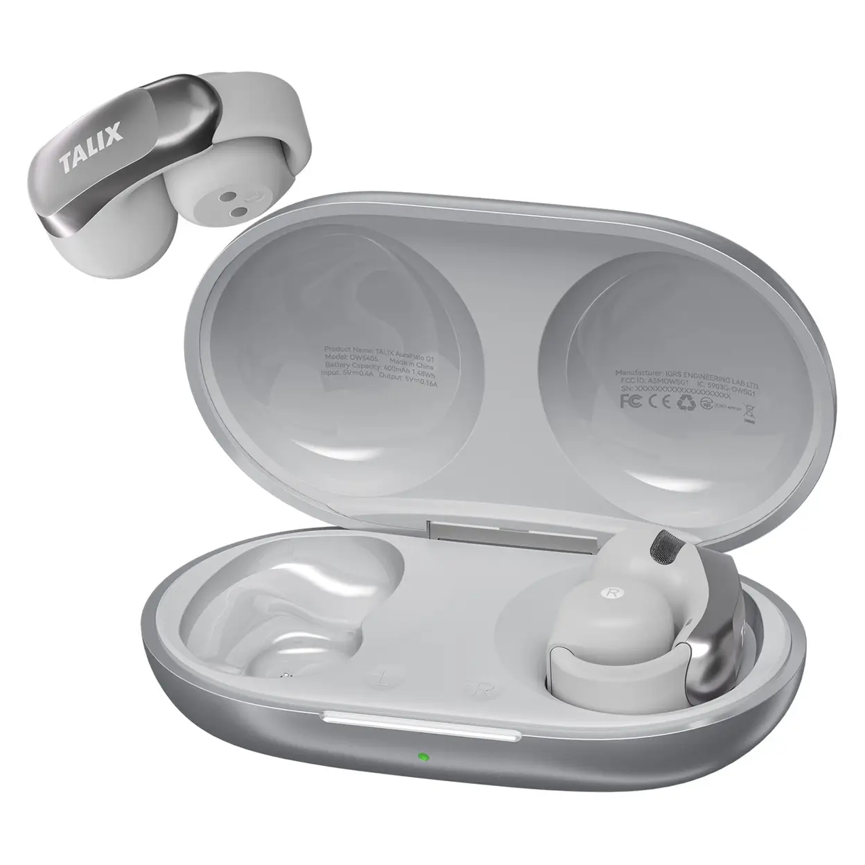 TALIX Ultra-Light Clip-On Wireless Earbuds, 4-Mic Clear Calls, 28H Battery, Fast Charge, Bluetooth 5.3, IPX4 Waterproof, Silicone Earhook, G1, Grey