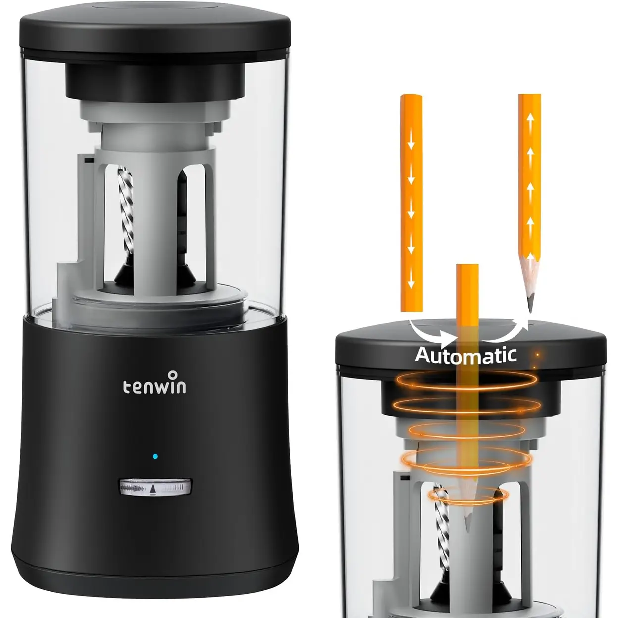 tenwin Electric Pencil Sharpener, Fully Automatic Pencil Sharpener for 6-8mm Colored Pencils, Hands-Free Rechargeable Sharpener, Fast Sharpening, No Uneven Tips, Also for Short Pencils, Black