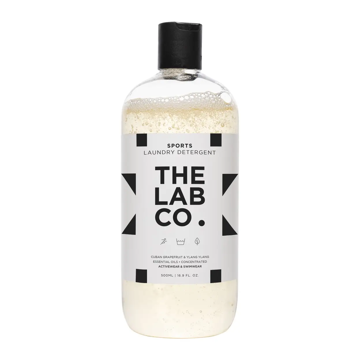 The Lab Co. Sports Laundry Wash. 500ml for up to 32 washes. Cuban Grapefruit and Ylang Ylang. For active-wear and swimwear. Non-Bio detergent suitable for hand-wash and machine washing.