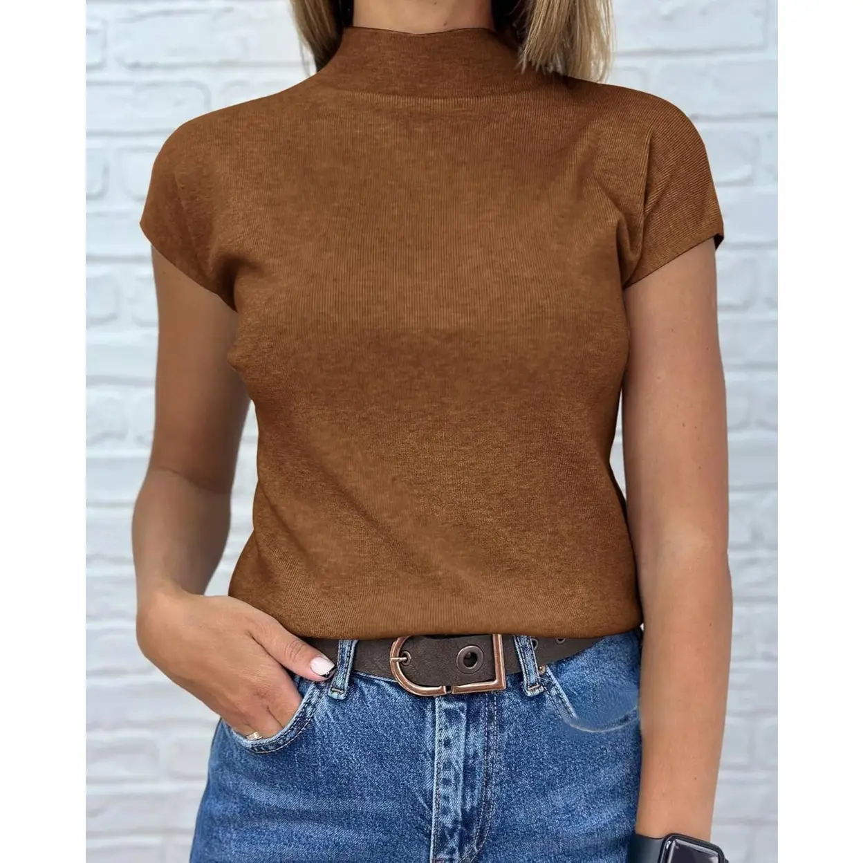 Women's Short Sleeve Sweater Mock Neck Summer Casual Basic Knit Slim Fitted Pullover Tops Shirt (khaki, S)