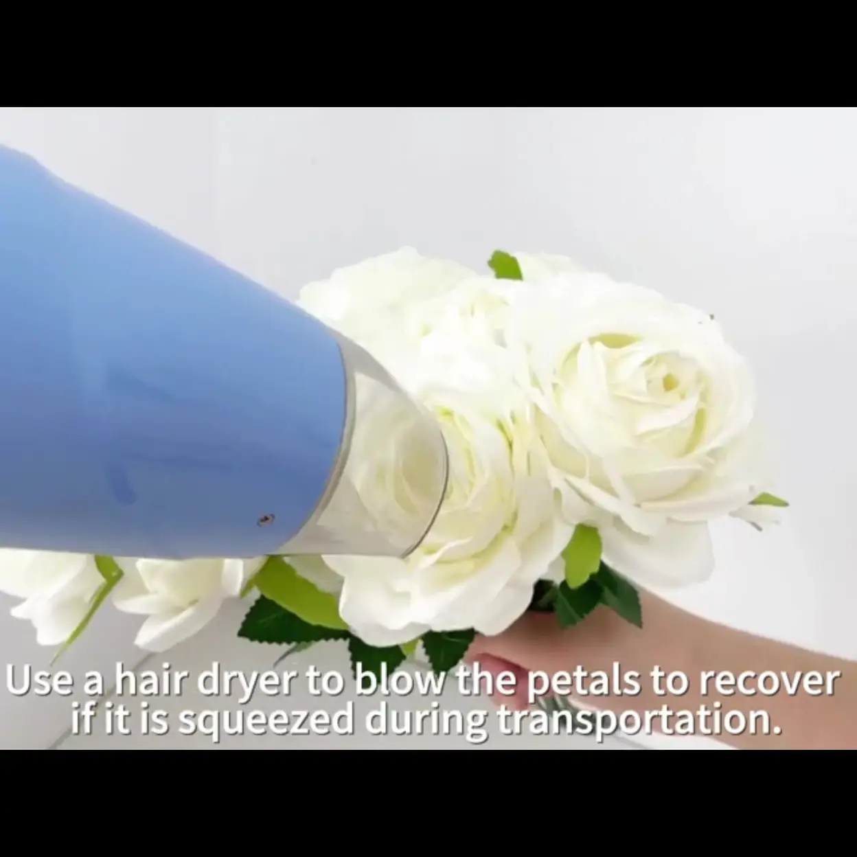 No installation required. Gently shape the stems as desired. Clean by dusting with a soft cloth or using a hairdryer on a cool setting. If flowers are compressed during transit, restore shape by gently fluffing the petals.