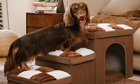 FunnyFuzzy Chessboard Plaid Handcrafted Dog Stairs with Storage Three Steps Brown