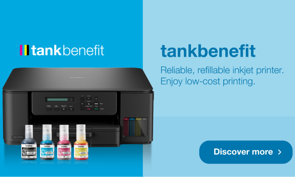 Save time with the Brother DCP-T580DW TankBenefit printer, featuring easy-fill tanks, high-yield ink bottles, and the Brother Mobile Connect app for convenient printing and ink management.
